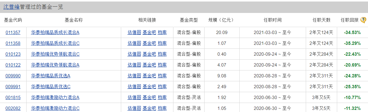 02、沈雪峰现任8只基金有4只规模低于2亿,近2年业绩跌幅均超40%