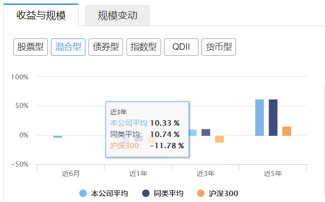 以混合型基金为例,近3年投资收益,华泰柏瑞平均10.33%,同行10.74%,沪深300下跌11.78%,因此,跑输同行0.41%,远远超过沪深300。