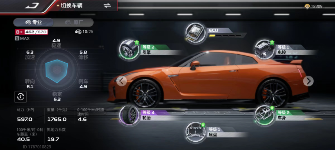 游戏采用了纯数值化的方式来衡量车辆强度,车辆的提升空间并不小。其中包括ECU、引擎、轮胎、底盘、车身、电控6项养成内容,对应材料的获取主要通过车间生产、活动或购买礼包,平均下来每辆车的加成会在30%-100%之间,传奇车辆的属性差距也比较明显。