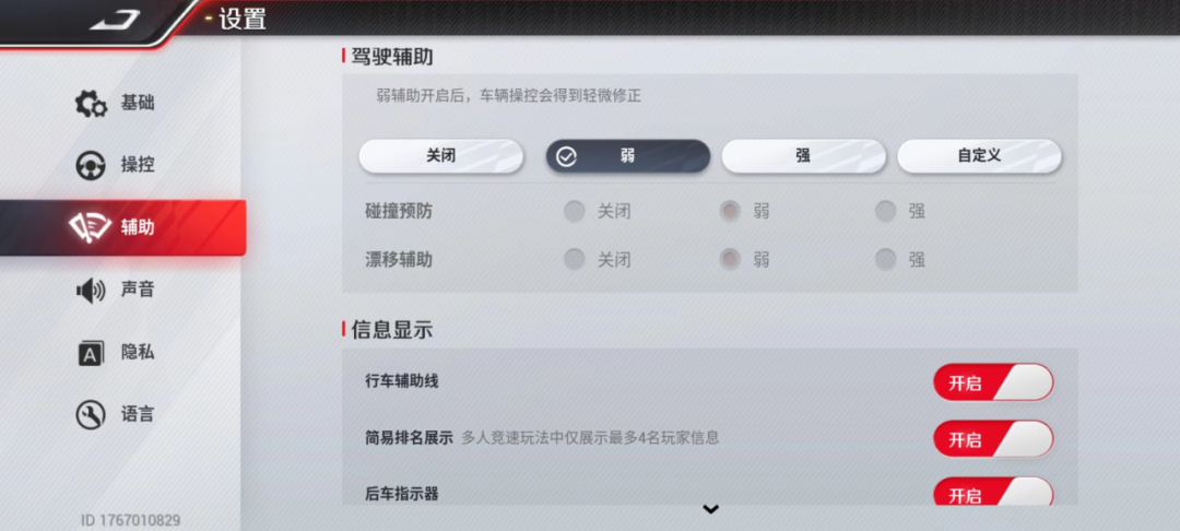 随着玩家操作变得熟练,游戏会开始建议弱化部分辅助系统(碰撞预防、漂移辅助),玩家也可以主动关闭行车辅助线等功能。