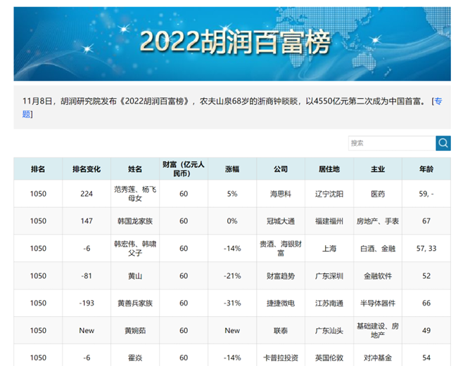 韩啸是河南富二代,与其父韩宏伟一起,以60亿身家名列2022年胡润百富榜第1050名,在全球酒行业富豪中排名第5。
