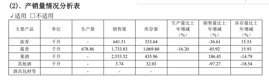 但截至2022年底,石股份的浓香酒生产量为0,销售量为641.51千升;果酒生产量为0,销售量2553.52千升。浓香酒和果酒两大板块100%依赖外采。