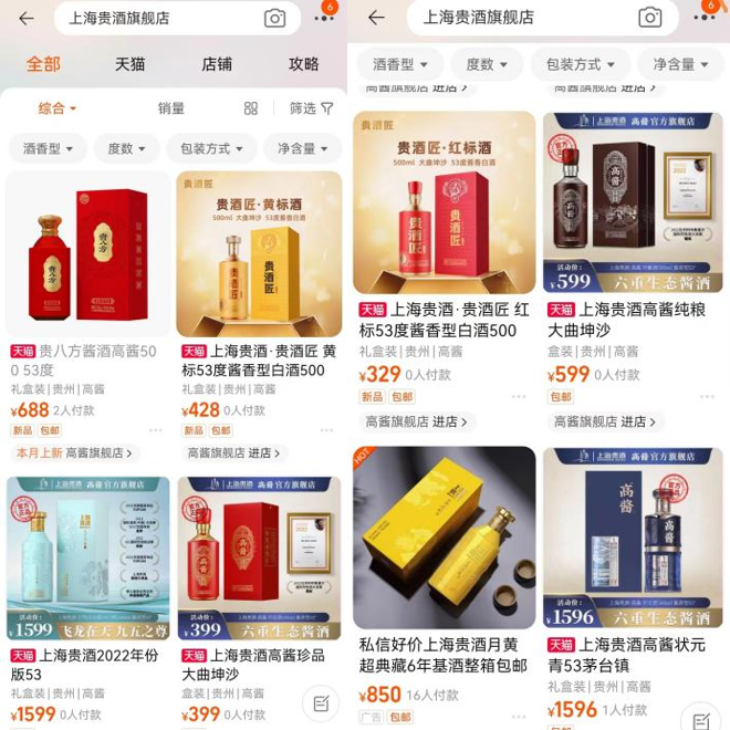 淘宝平台显示,岩石股份旗下上海贵酒产品售价在329元-1599元价格带不等,品牌有贵酒匠、高酱500、高酱状元青等。