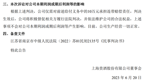 2021年7月13日,南京中级人民法院作出一审判决,要求被告二自本判决生效之日起立即停止生产、销售侵害原告第101911号、8550010号“贵”注册商标专用权商品的行为,且赔偿经济损失及制止侵权的合理费用100万元;要求被告一承担给付义务中的20万元连带赔偿责任;驳回原告其他诉讼请求。