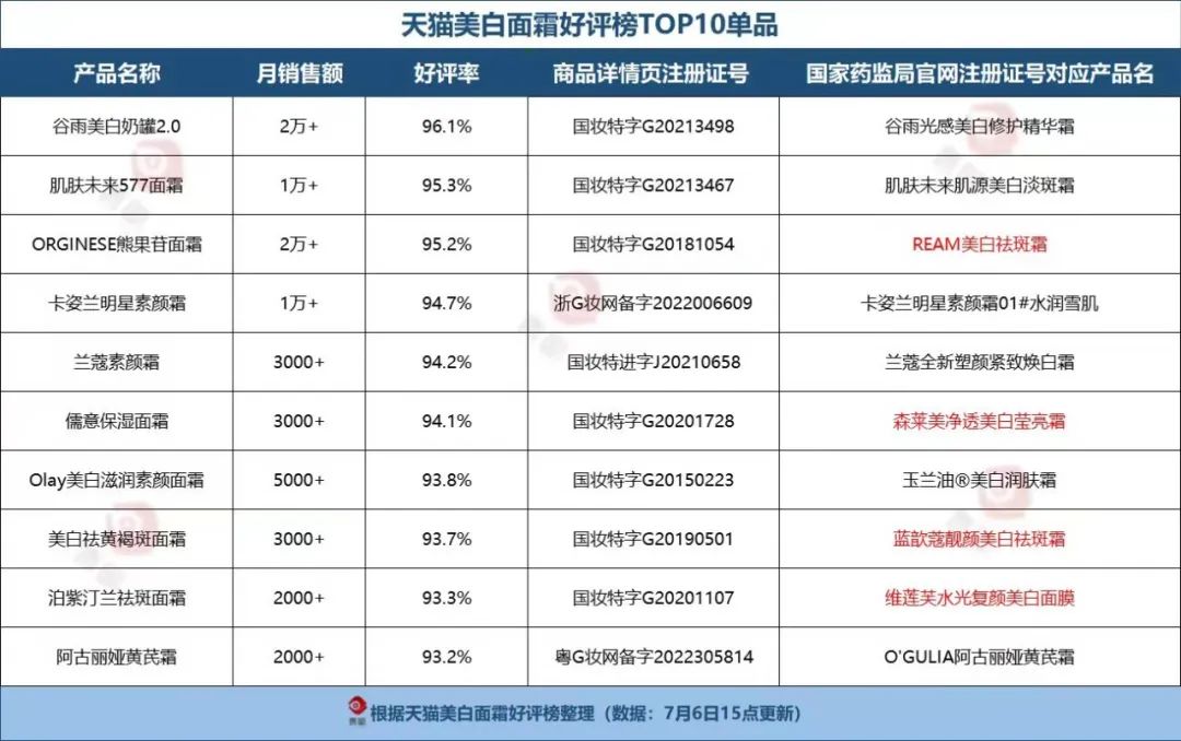 今日,青眼调查发现,在天猫美白面霜好评榜TOP10中,有4个品牌的美白产品,其商品详情页面显示的特殊化妆品注册证号,存在与国家药监局公示特证信息不一致的情况。