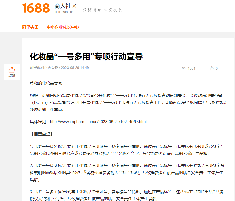 近日,阿里规则官方头条对化妆品卖家颁布了《化妆品“一号多用”专项行动宣导》(下称《宣导》),对自查重点、管控要求、管控时间、处置原则等相关内容进行了明确的规定。据了解,该《宣导》已于7月3日正式实施。