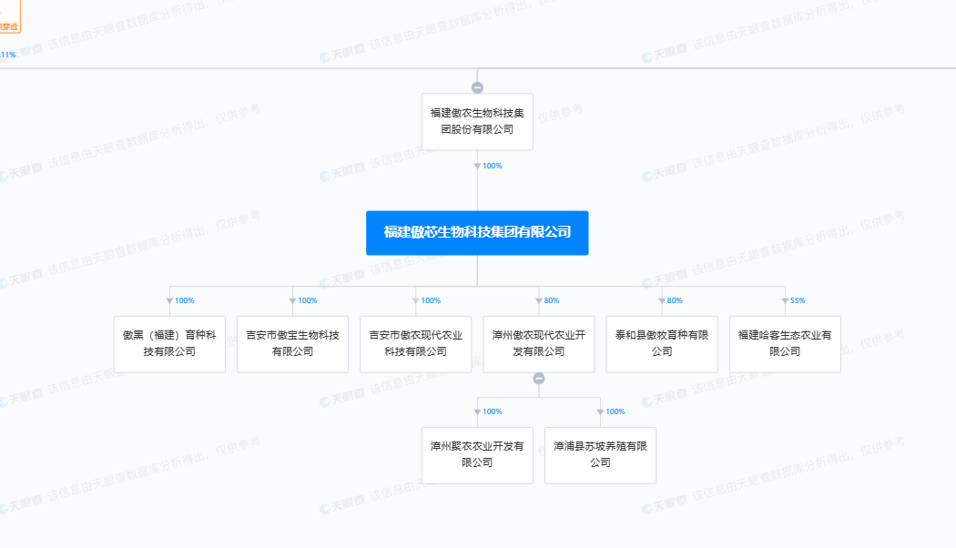 天眼查显示,近日,福建傲芯生物科技集团有限公司成立,法定代表人为丁能水,注册资本2.5亿元,经营范围包含:生物基材料技术研发;农业科学研究和试验发展;中草药种植;新鲜水果零售等。股权穿透显示,该公司由傲农生物100%控股。
