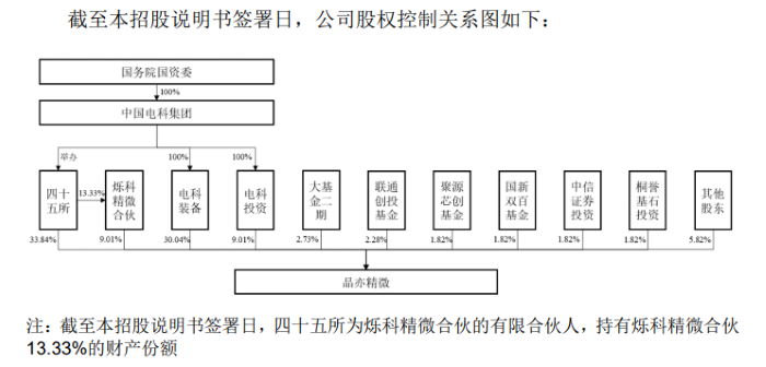 截至招股书签署日,四十五所直接持有公司33.84%股份,电科装备持有30.04%股份,电科投资持有9.01%股份,烁科精微合伙持有 9.01%股份。四十五所为中国电科集团举办的事业单位,电科装备和电科投资为中国电科集团全资子公司,同时四十五所与烁科精微合伙签署了《一致行动协议》。