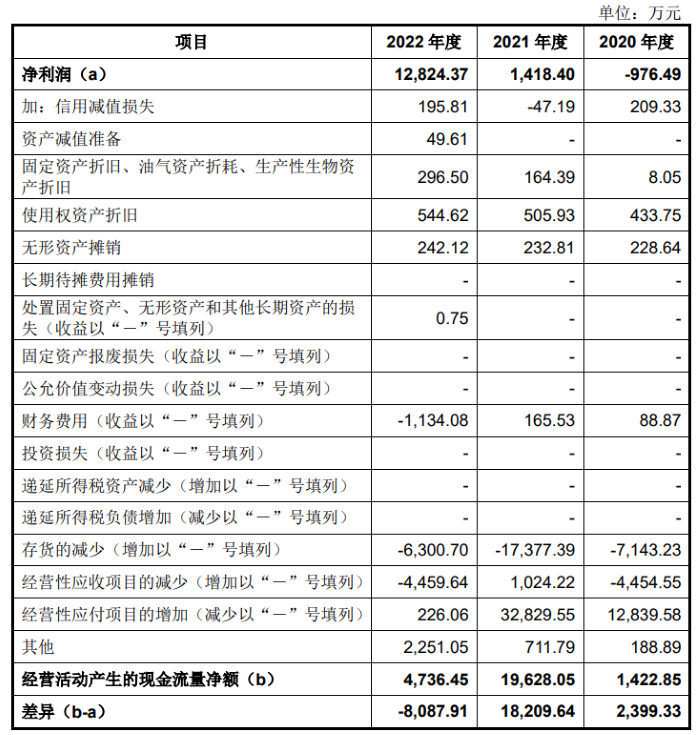值得注意的是,报告期内,公司经营活动产生的现金流量净额分别为1422.85万元、1.96亿元和4736.45万元,净利润分别为-976.49万元、1418.40万元和1.28亿元。2021年-2022年经营活动产生的现金流量净额降幅明显。