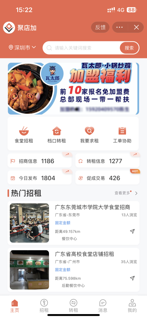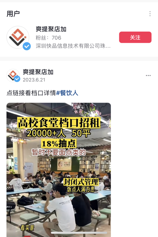 依托多年深耕高校餐饮市场的储备资源,快品公司创新推出了“爽提聚店加”平台,并逐步推广至团餐领域,为更多有此需求的商家提供便利。平台内提供的各种资讯信息应有尽有,包括食堂招商、档口求租、档口转让等。