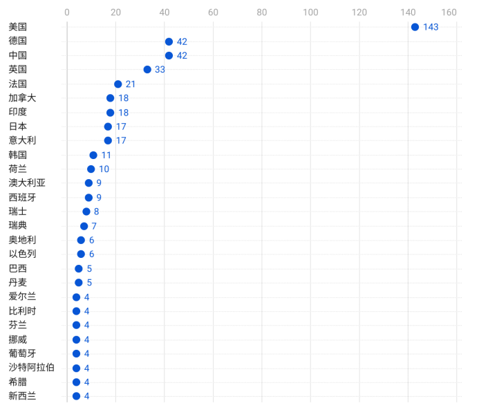 图表 1 全球人工智能创新城市前500城市数量4以上国家分布