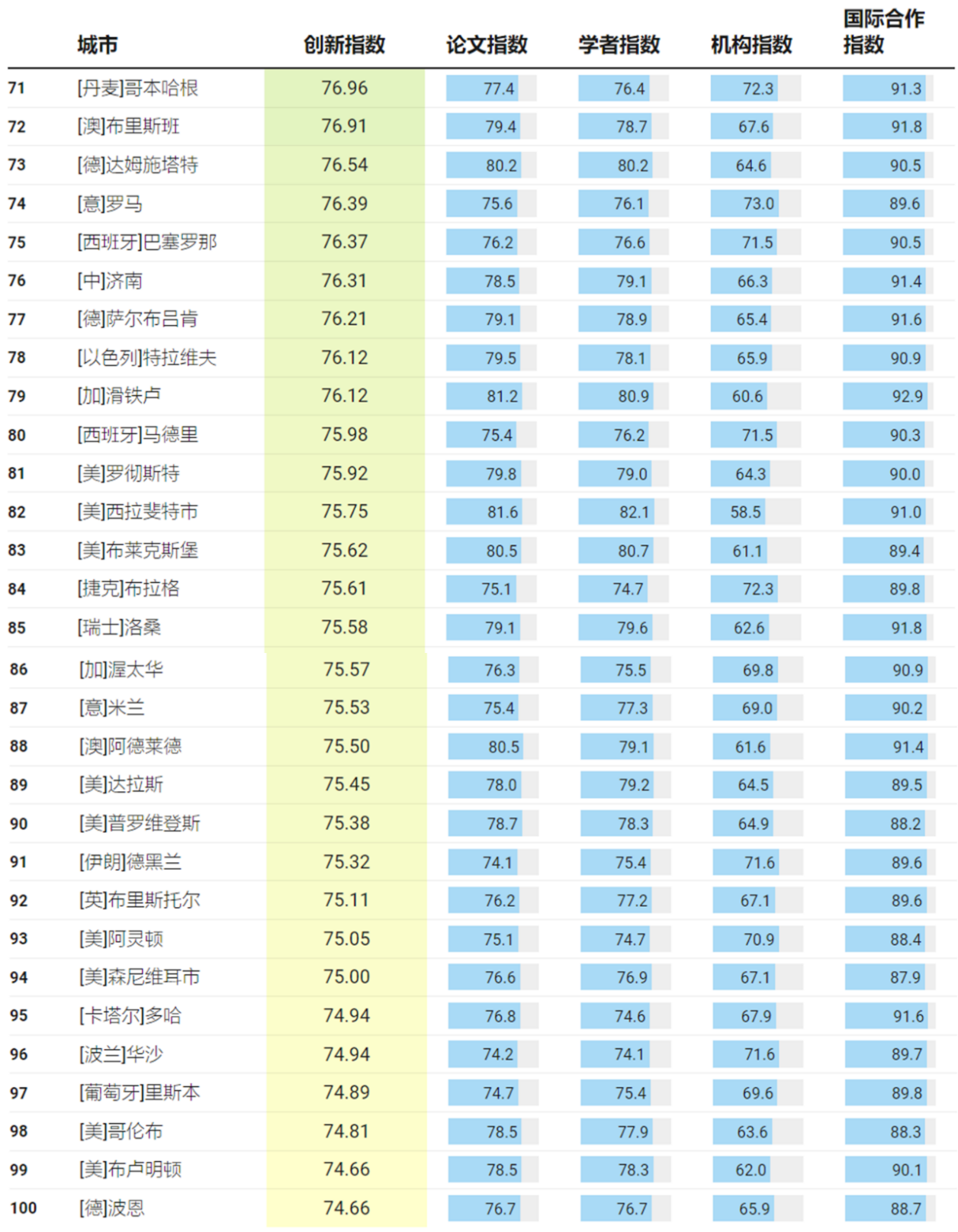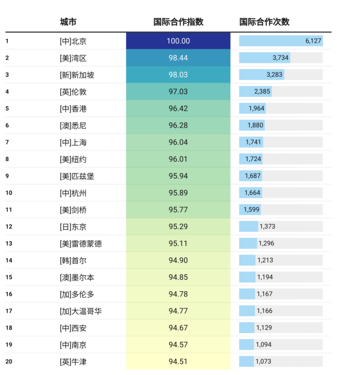 通过对创新指标分析得出,北京的创新指数位列全球前十,排名全球第二。而在论文、学者、机构和国际合作四个维度的得分中,北京居国内首位。香港、上海、杭州、深圳和南京的综合得分进入全球前二十,表现也十分亮眼。