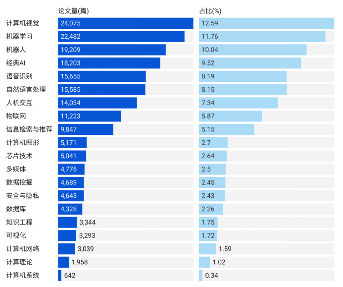 虽然现在网络上有不同的语言说计算机视觉“已死”,但是从全球人工智能发表的论文中可以看出,计算机视觉方向的论文依然最多,有24075篇,占12.59%。