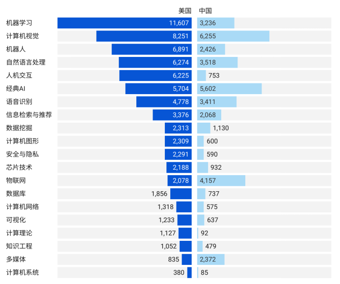 中国和美国作为人工智能研究的两大强国,论文数量及子领域研究分布呈现了较大的差异。目前全球人工智能研究美国仍处于领先位置,相关论文量是中国的2倍。美国侧重于机器学习、计算机视觉、机器人等的研究,而中国则是计算机视觉、经典AI、物联网;尤其是物联网,论文量约是美国的2倍。