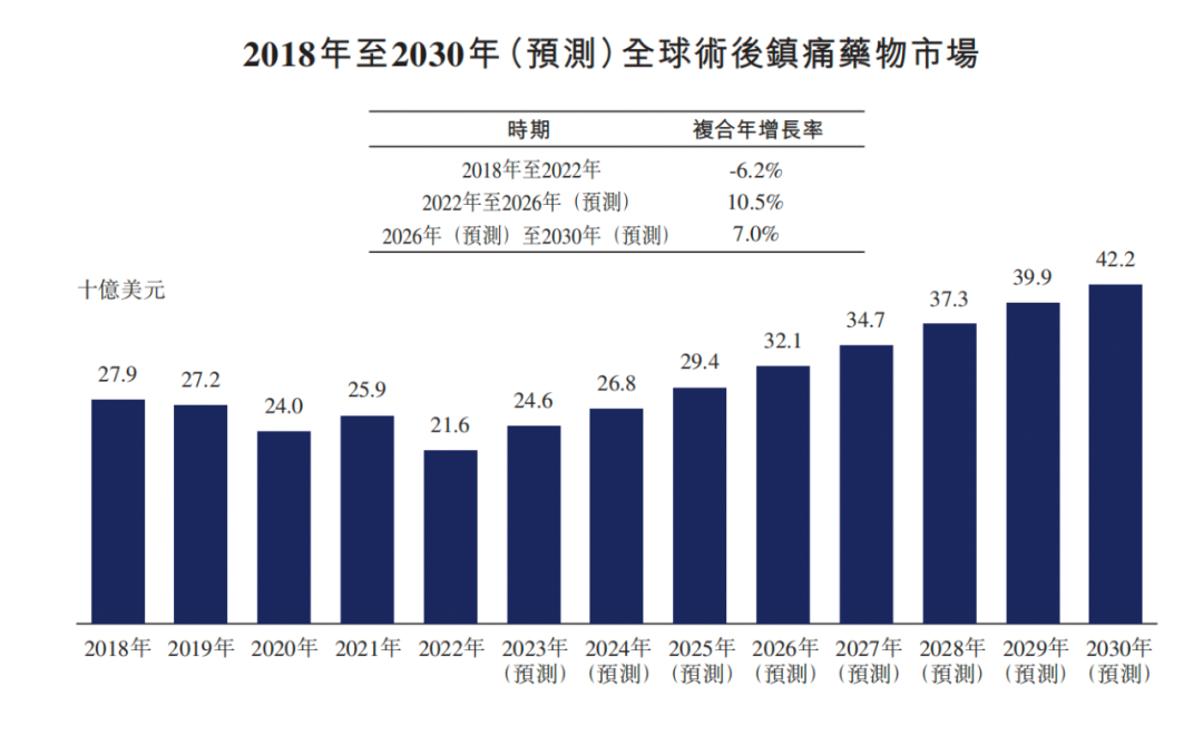 虽然市场规模收缩,但弗若斯特沙利文等机构预测称,2022年后,全球的镇痛药物市场规模将逐渐复苏,预计全球术后镇痛药物市场规模将于2026年及2030年分别达到321亿美元及422亿美元。