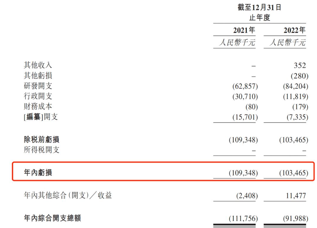 招股书显示,2021年和2022年,加立生科的亏损金额分别为1.09亿元和1.03亿元。在没有收入的同时,加立生科仍要支付高昂的研发开支以及行政开支。