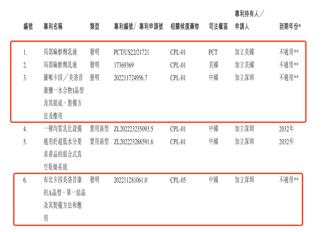 截至招股书签署之日,加立生科共有6项专利。其中,有3项发明专利和2项实用新型专利所对应的候选药物为CPL-01;1项发明专利相关候选药物为CPL-05(美洛昔康的缓释剂)。