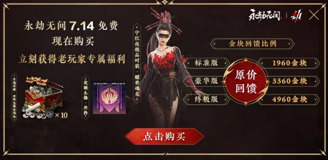 解除了合作协议的束缚,网易没有让曾经付费购买的玩家一朝化身“怨种”,在一众买断付费玩家“退款”的吐槽呼声下,《永劫无间》宣布在7月14日前购入游戏并建立角色的玩家,都将获得角色“宁红夜”时装、定制头像、宝箱以及对应购买版本的金块(游戏商城货币)的回馈。