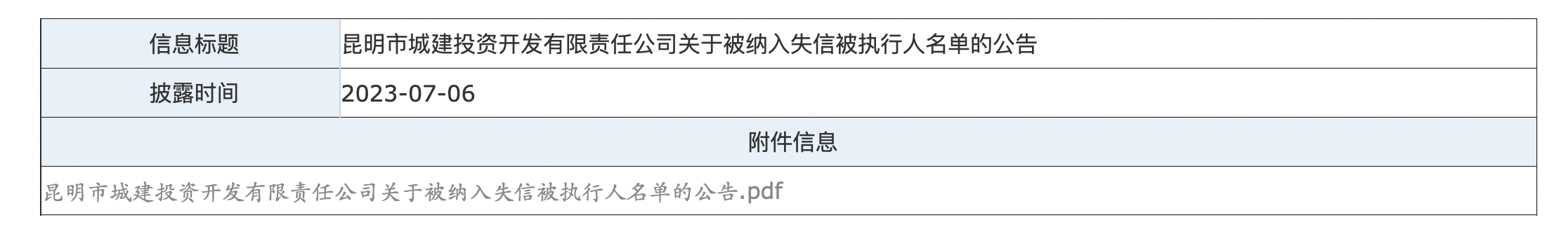 7月6日,北京金融资产交易所披露公告,昆明市城建投资开发有限责任公司(简称“昆明城投”)被纳入失信被执行人名单。