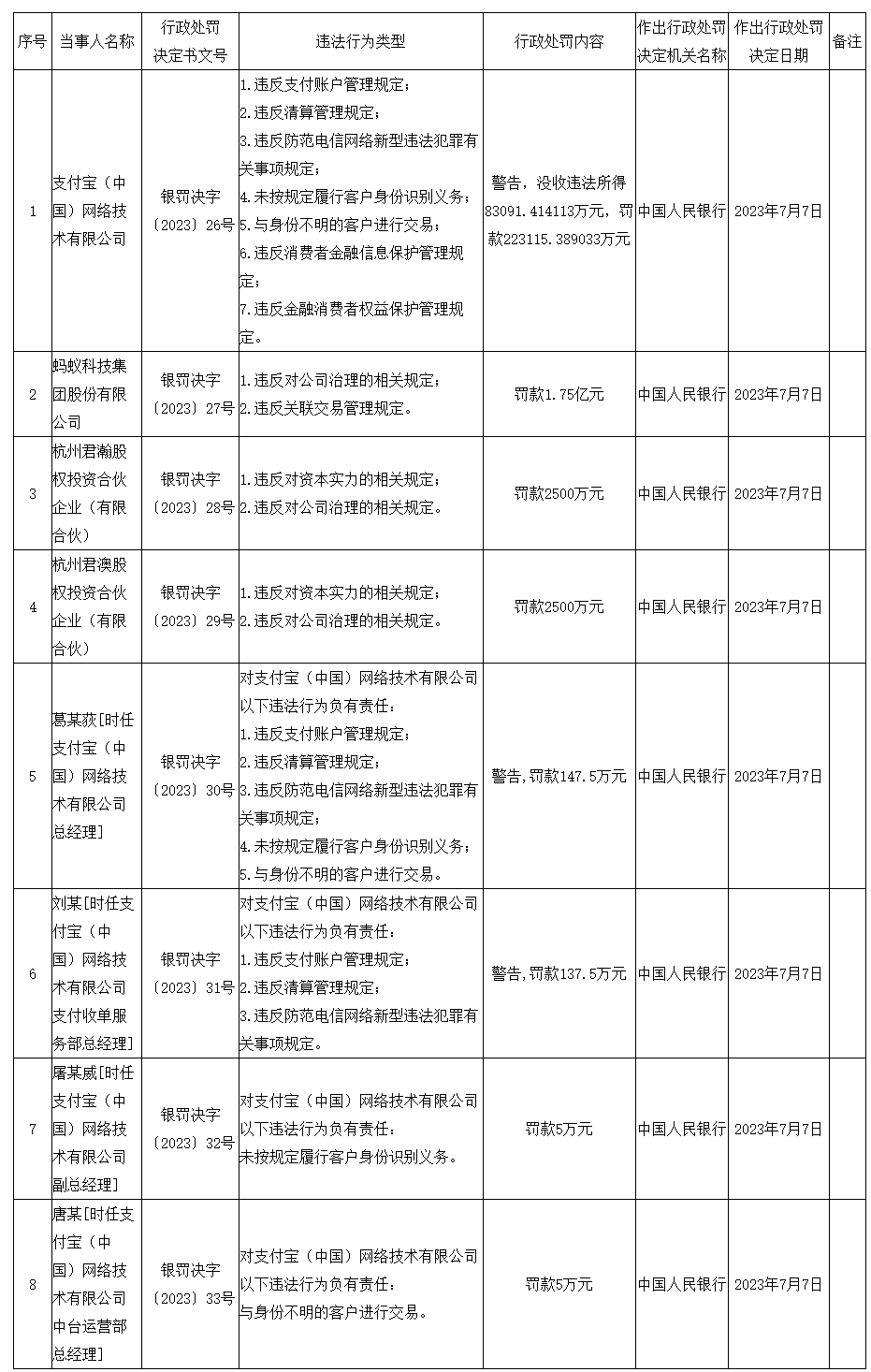 人民银行还对蚂蚁集团旗下的第三方支付平台——支付宝开出了7张罚单。罚单显示,支付宝(中国)网络技术有限公司被警告,没收违法所得83091.414113万元,罚款223115.389033万元,时任支付宝(中国)网络技术有限公司总经理葛某荻等4人也收到央行罚单。