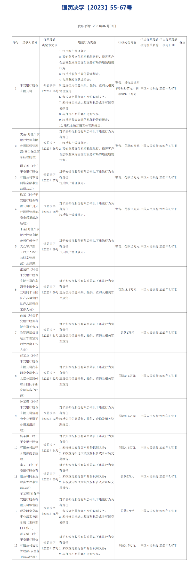 央行7月7日披露的行政处罚信息显示,因事涉10项违法行为,平安银行受到监管部门警告,并没收违法所得1848.67元,罚款3492.5万元。