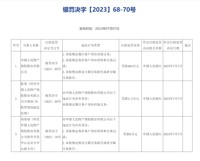 中国人民财产保险股份有限公司因未按规定履行客户身份识别义务、未按规定保存客户身份资料和交易记录、未按规定报送大额交易报告或者可疑交易报告三类违法行为被罚464万元,同时另有2人收到央行罚单。