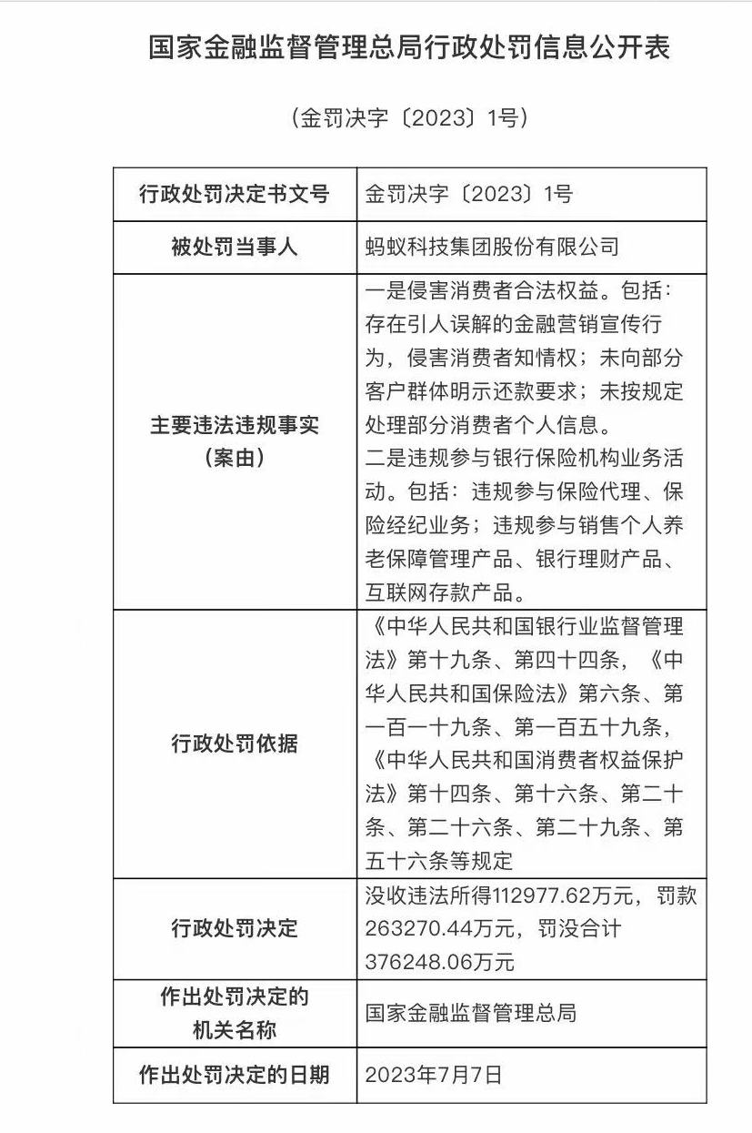 据界面新闻记者统计,国家金融监管总局2023年1号罚单显示(图1),对蚂蚁科技集团股份有限公司没收违法所得112977.62万元,罚款263270.44万元,罚没合计376248.06万元。