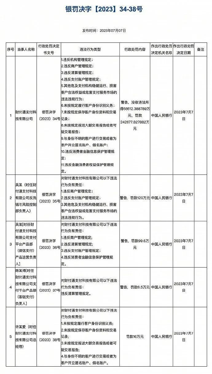 7月7日,人民银行公布行政处罚信息显示(图3),财付通支付科技有限公司被没收违法所得56612.388789万元,罚款242677.827882万元。