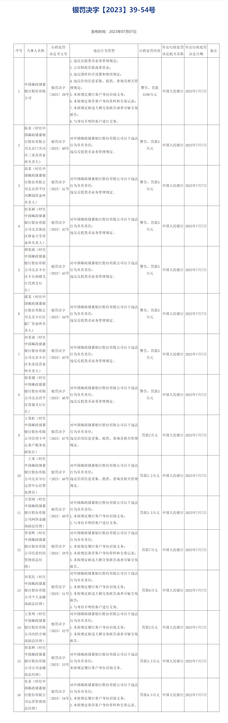 邮储银行因10类违法行为被罚3186万元,另有15个人收到央行罚单。