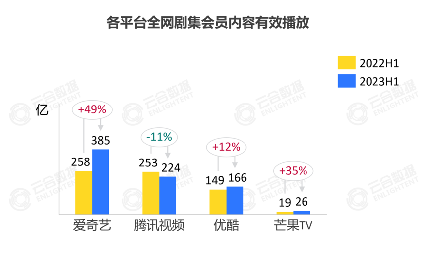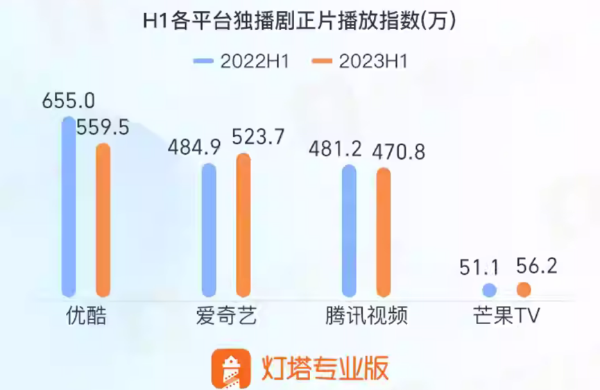 但2023年至今,芒果TV在剧集上的落后状态并无明显改变。灯塔数据显示,2023H1芒果TV独播剧正片播放指数为56.2,其他三大平台则都在500左右,约为芒果TV的十倍;同样的,云合数据2023H1全网剧集正片有效播放统计中芒果TV为38亿,其他三大视频平台则达到600亿、400亿、300亿+,相比之下也是十倍以上的差距。