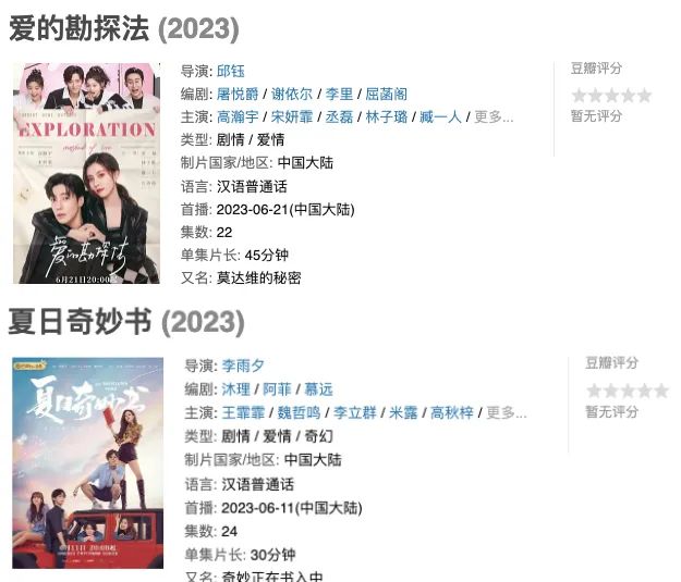 比如6月芒果TV播出的两部主打新网剧《爱的勘探法》和《夏日奇妙书》,播出后基本与热搜无缘,也很难进入各大榜单TOP10甚至TOP20,豆瓣至今没开分就算了,短评数量甚至都只有5、600条,不要说和动辄几万条短评的头部大剧比了,基本就和其他平台一般的小分账网剧差不多。