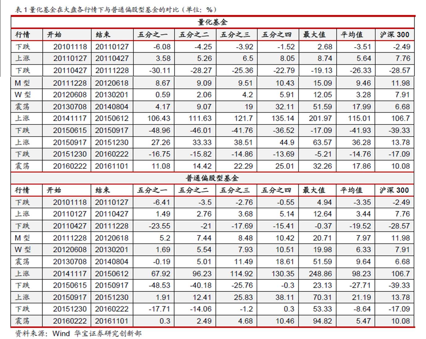为了更好的判断量化基金所适应的行情,华宝证券最近做了一个专题研究,将市场行情分为上涨、下跌、震荡M型、W型、A型,并区分大盘与中小盘,计算了各行情下量化基金和普通偏股型基金的收益率情况。