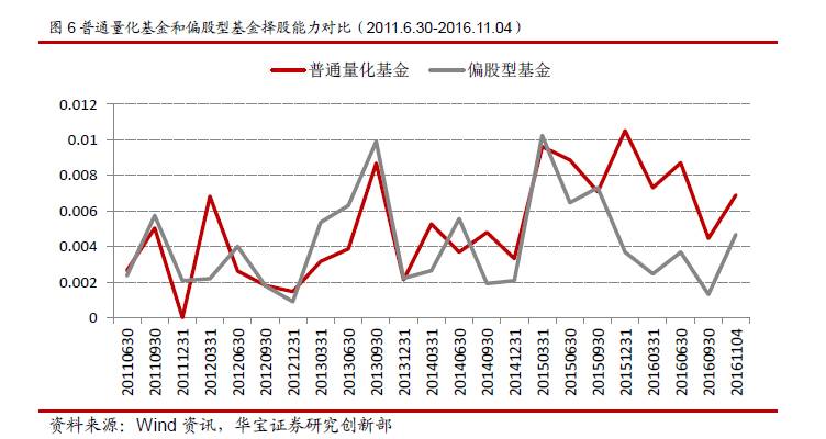 在择股能力方面,如上图所示,2011年6月至今(2016年11月4日),量化基金的择股能力普遍高于偏股型基金。