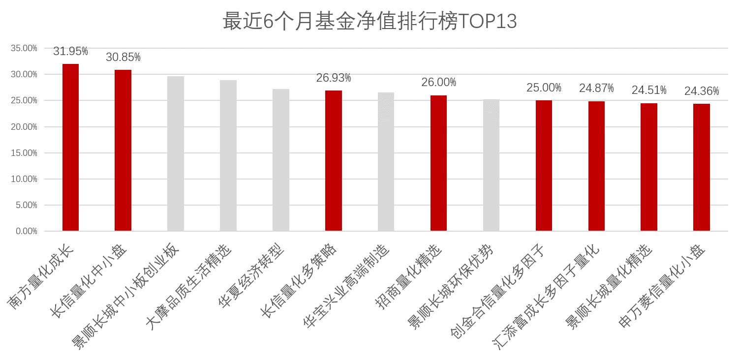 WIND数据显示,截至11月18日,沪深300指数最近6个月涨幅为11.3%,普通股票型基金同期平均净值增长率为15.96%,其中多只量化型基金表现抢眼,南方量化成长和长信量化中小盘基金更是以超过30%的净值增长率,占据同类基金业绩排名头两把交椅,而同期业绩排名前13位的基金中竟有8只量化基金。