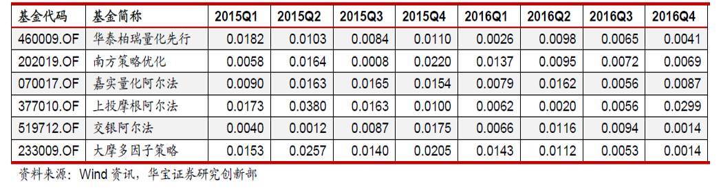 在投资量化基金时,应该首先对市场环境进行大判断,判断市场行情将处于趋势向上、趋势向下、大幅波动还是小幅震荡局面。当市场为趋势向上和小幅震荡时,选择择股能力较强的量化基金进行投资。根据回溯数据,连续八个季度都具有择股能力的量化基金如下表所示。