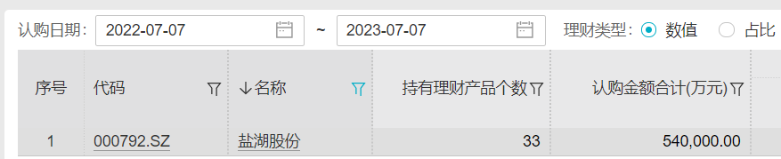 近一年以来,盐湖股份持有理财产品33个,认购金额合计54亿元。从认购金额看,排名第30名,从理财种类来看,购买信托金额28亿元居上市公司榜首。
