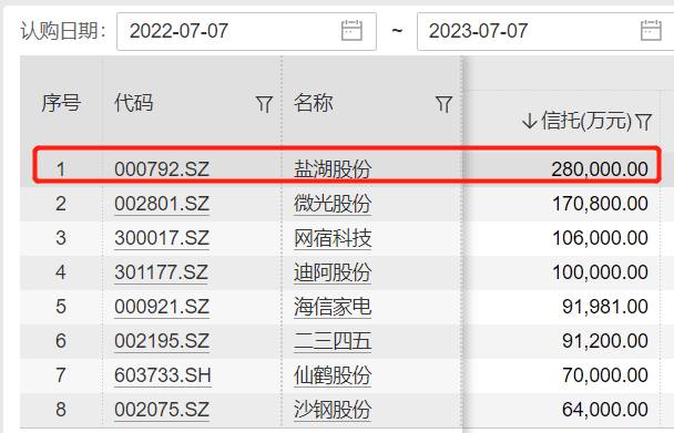 截至7月7日,盐湖股份今年以来共发布使用闲置资金进行证券投资或购买理财产品公告9次,累计购买信托产品超20亿元。