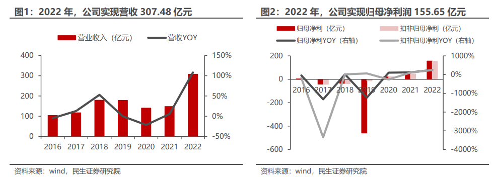 2022年盐湖股份业绩创历史新高。全年实现营收307.48 亿元,同比增加108.06%;归母净利润155.65 亿元,同比增加 247.55%。