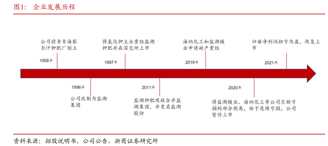 1958 年,我国首家钾肥企业——青海察尔汗钾肥厂成立。1997 年,公司重组为“青海盐湖钾肥股份有限公司”(盐湖钾肥),并在深圳证券交易所上市。2011 年,经吸收合并盐湖集团后,公司更名为“青海盐湖工业股份有限公司”。两湖成功合并,盐湖股份诞生。