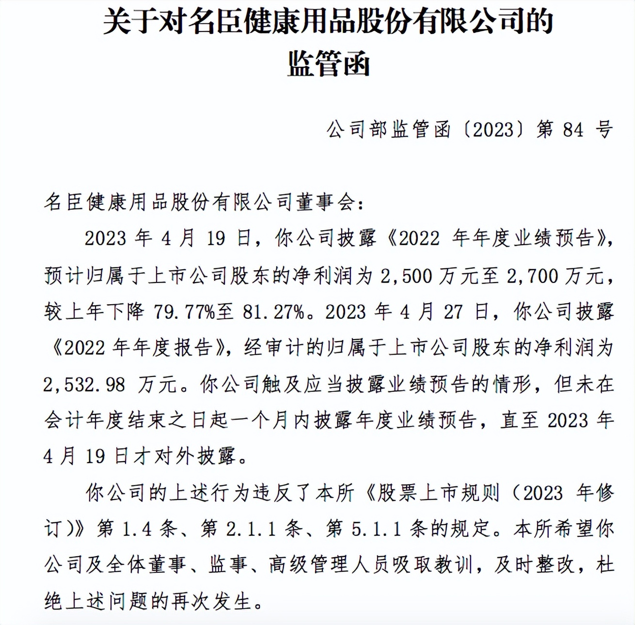监管函向名臣健康董事会指出,2023年4月19日,公司披露的《2022年年度业绩预告》预计归属于上市公司股东的净利润为2500万元至2700万元,较上年同期下降79.77%至81.27%。4月27日据《2022年年度报告》显示归属于上市公司的净利润为2532.98万元。名臣健康公司触及了应当披露业绩预告的情形,但公司并未在会计年度结束之日起一个月内披露年度业绩预告,直至2023年4月19日才对外披露。