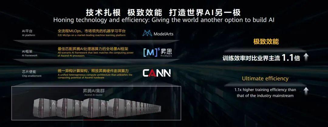 业界观察,华为不仅提及昇腾芯片,更强调上述软硬件根技术组成的昇腾云底座。由于行业中最成熟的GPU以及相关软件,华为都不可用,它转而发展全栈根技术:最底层是鲲鹏、昇腾为基础的AI算力云平台,之上是异构计算架构CANN、全场景AI框架昇思MindSpore,以及AI开发生产线ModelArts。“现在基于华为的AI根技术,我们大模型训练效能不仅不落后,还可以调优到业界主流GPU的1.1倍。”张平安在大会上透露了这个业界关注的数字。