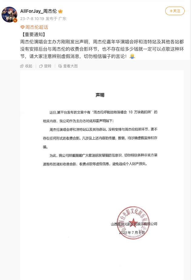 近日,某平台发布的文章中有“周杰伦呼和浩特演唱会10万块钱拍照”的相关内容。7月8日,周杰伦演唱会主办方发布声明:周杰伦演唱会呼和浩特站以及其他各站没有安排与周杰伦拍照环节,更不存在任何形式的收费合影,上述内容的传播、推销均涉嫌虚假宣传和诈骗。主办方提醒广大歌迷朋友增强防范意识,切勿相信非官方渠道散布的诸如收费合影、点歌等虚假信息,避免造成个人财产损失。