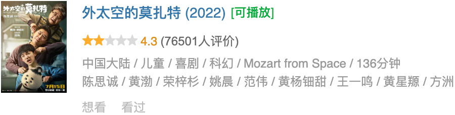 比如《外太空的莫扎特》。也号称要做成系列,后续还有《外太空的莫奈》和《外太空的肖邦》,但在仅获得4.3的豆瓣评分和刚破2亿的票房后,已经“埋起来了”。