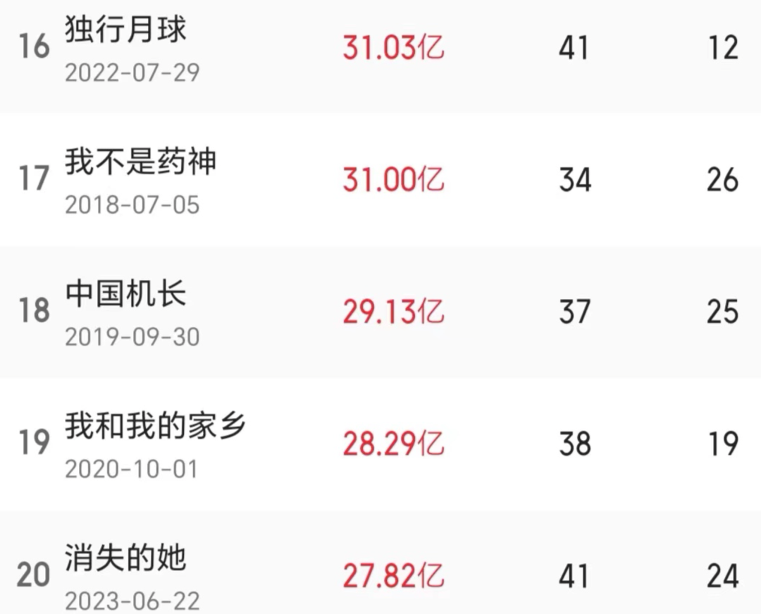 更别说正在热映的《消失的她》,票房将稳步迈入30亿级别,最终票房35亿+也未尝没有可能。