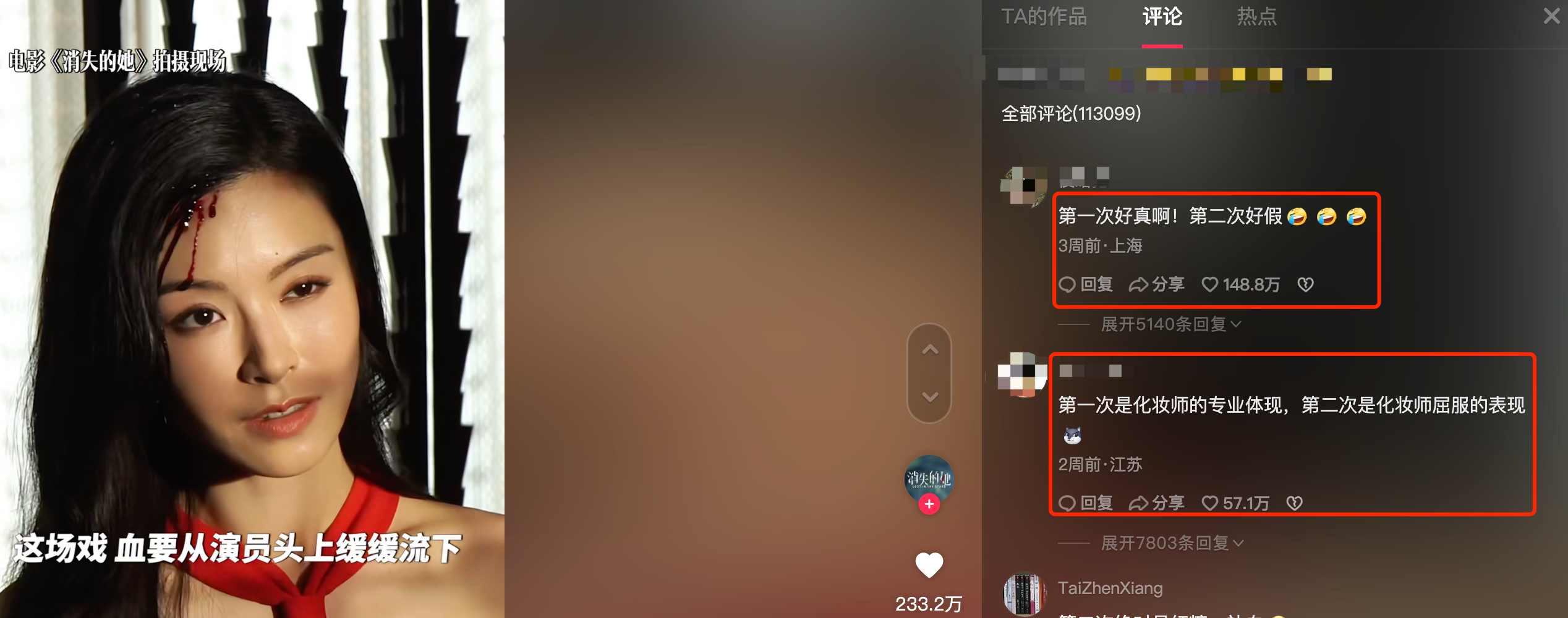 《消失的她》在抖音,拥有多条百万赞的视频,数十条几十万赞的视频,涉及有趣的拍摄花絮、演员演技高光等多个领域。