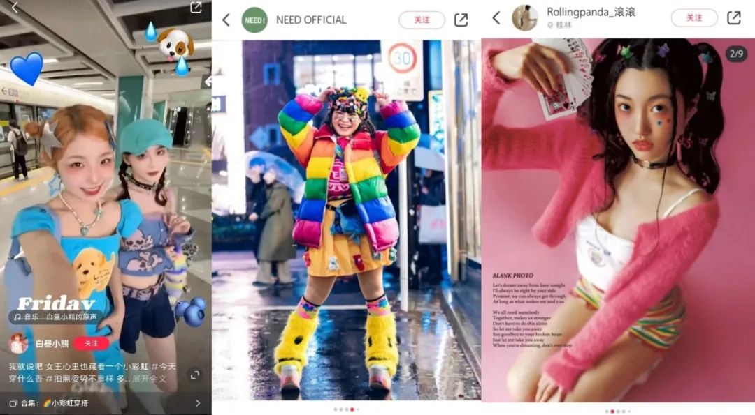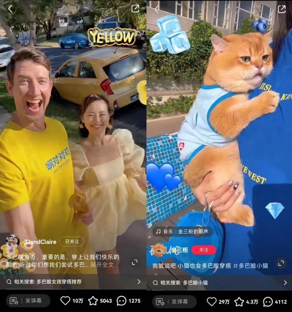 △小红书up主TJandClaire以及宠物up主金三柜也加入了“多巴胺穿搭”战队
