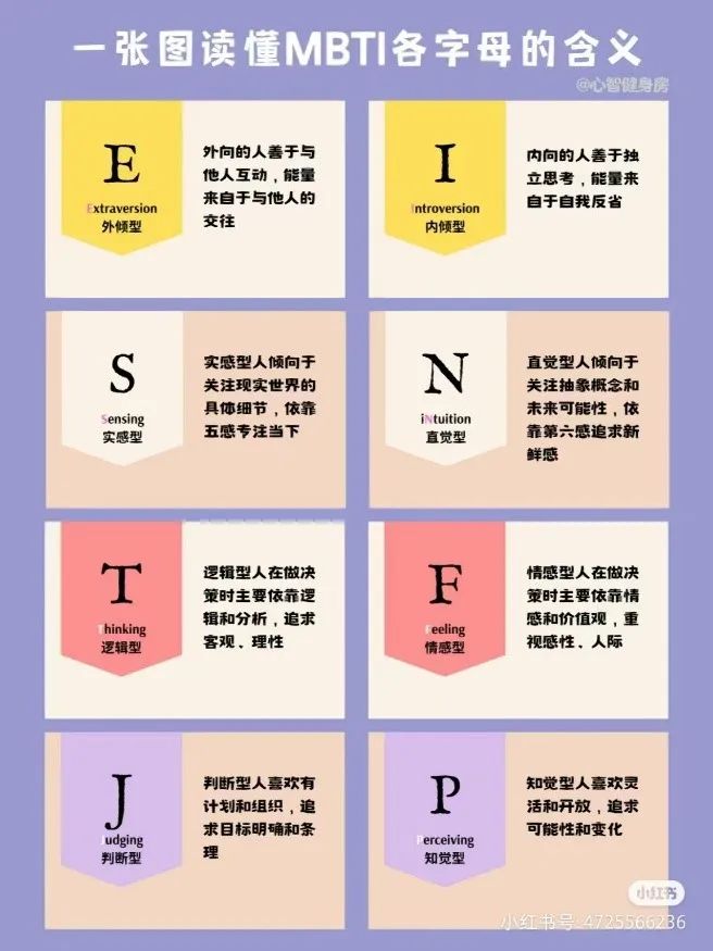 “MBTI”会根据题目的回答情况将人们分为16种类型,每种类型会包含四个字母,每个字母表示一种性格特质,比如E表示外向,I表示内向。这也是E人与I人的由来。