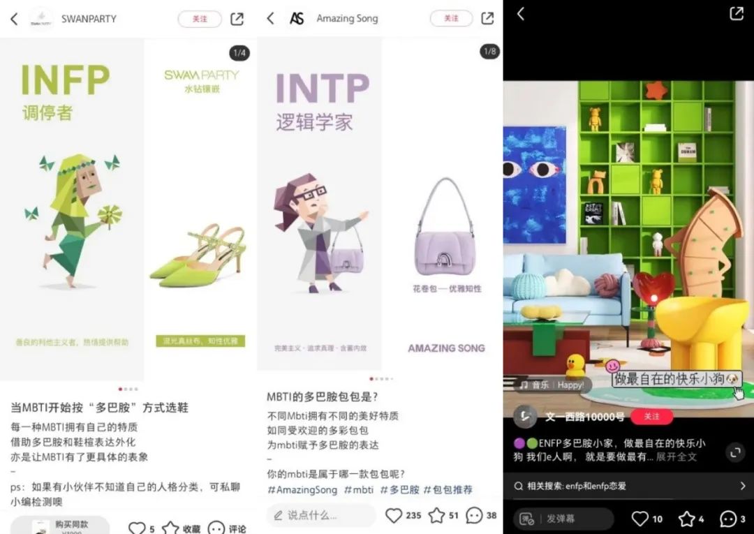 社会群体行为的动向与特征也在挑动着商家的神经。注意到这一风潮的商家也开始将“多巴胺”与“MBTI”性格相结合,试图将“拟剧理论”应用于实践,让用户对个人人设的执着穿透理智,增强自我对性格“应有行为”的印象,让每一次消费都变成个体印象管理的一部分。