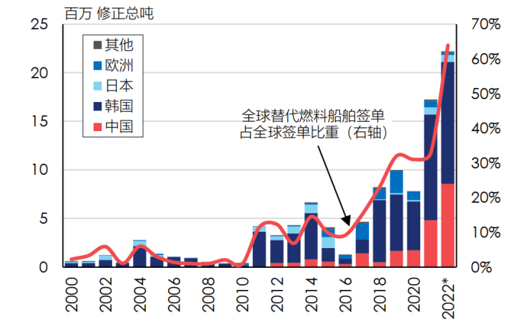 英国造船和海运分析机构克拉克森数据显示,2022年替代燃料船舶首次在新船订单中占据一半以上的份额,占新船订单总量的60%左右。要知道,过去三年,新能源船舶在新船订单中渗透率都徘徊在三成左右。