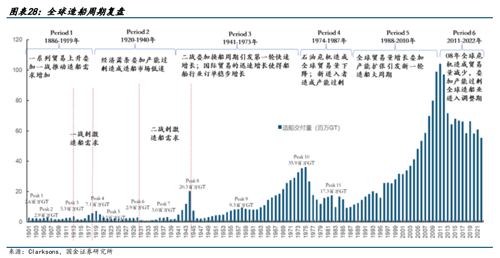 船舶具有明显的周期性特征。上世纪90年代-2009年,全球贸易增长叠加上一轮周期船龄到期替换需求,2003年前后全球造船产量恢复至1975年的历史高点水平,并在2009年左右较曾经的历史高点翻倍。